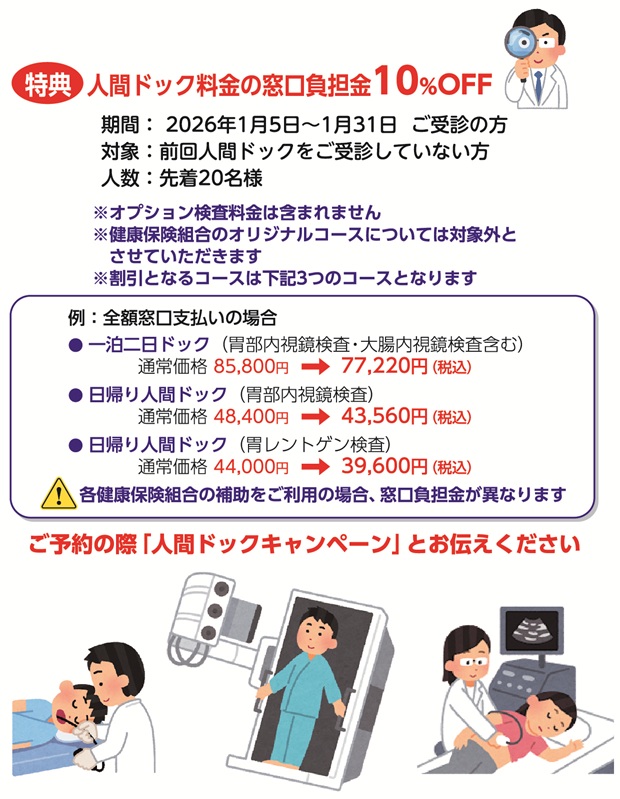 今回は、2026年1月に行う『人間ドックへのグレードアップキャンペーン』のお知らせです。まだ今年度健康診断を受けていらっしゃらない方におすすめです。